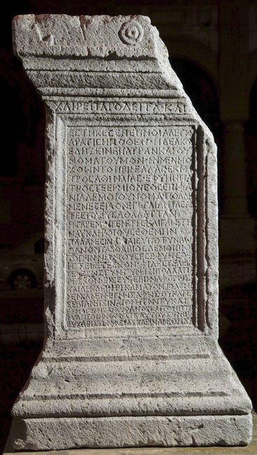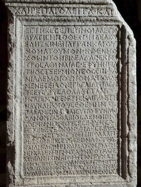 χαῖρε, παροδεῖτα καὶ σ[ύ]·// ἕστηκες ἐπ’ ἐννοίᾳ λέγων/ἄρα τίς ἢ πόθεν ἥδε ἄκου/ε δὴ ξεῖνε πάτραν καὶ οὔ/νομα τοὐμόν ἦν μέν μοι̣/ χθὼν τὸ πρὶν Ἑλλάς ἐκ μη/τρὸς Ἀθηναίας ἐφύην, πα/τρός τε Ἑρμιονέος· Ἐπιφα/νία δέ μοι οὔνομα πολλὴν̣ / μὲν ἐσεῖδον ἐγὼ γαῖαν πᾶσάν / τε ἔπλευσα θάλατταν· / ἦν γὰρ ἐμοὶ γενέτης καὶ γαμέτης̣/ ναύκληροι, οὓς ἐθέμην / παλαμε̑σιν ἁγναῖς ὑπὸ τύνβῳ / θανόντας· ὄλβιος δέ μοι βίος / τὸ πρὶν ἦν· ἐν Μούσες ἐφύην σοφί/ης τε μετέσχον φίλες τε λειπο̣/μένες ὡς γυνὴ γυνηξὶ πολλὰ πα/ρέσχον εἰς εὐσεβίην ἀφορῶσα / καὶ δὲ κλεινήρη κάματον πολὺν ἐ/νένκαμεν ἔγνω σαφῶς ∙ οὐ κατ’ εὐ/σεβίαν εἰσὶν αἱ θνητῶν τύχαι· / Ἑρμογένης Ἀνκυρανὸς καὶ Τομίτης / φυλῆς Οἰνώπων τῇ ἑαυτοῦ συνβίῳ / εὐχαριστῶν μνείας χάριν ἀνέθηκα.