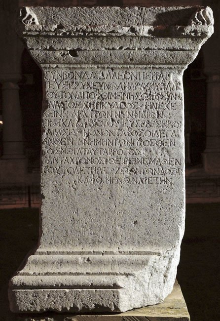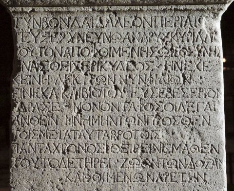 τύνβον δαιδάλεον περιαγέ[α] / τ̣εῦξε συνεύνῳ Ἄνδρυς Κυρίλλῃ / τ̣οῦτον ἀποφθιμένῃ, σωφροσύνης̣/ μ̣νασθεὶς ἐρικυδέος ἣν ἔχε /