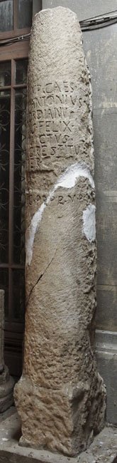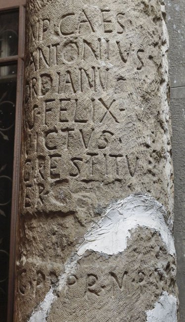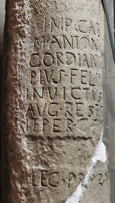 - Imp(erator) Caes(ar) / M(arcus) Antonius / Gordianus / Pius Felix / Invictus / Aug(ustus) restitu/it per [[C[---]]] / [[[------]]] / [[[------]]] / leg(atum) pr(o) pr(aetore) m(ilia) p(assuum)