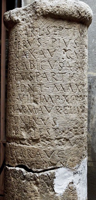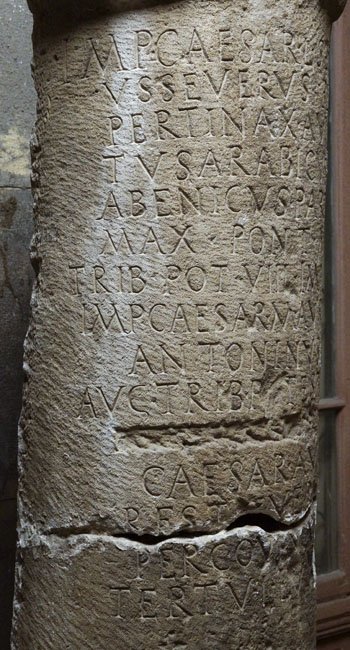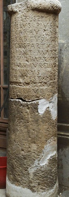 - Imp(erator) Caesar L(ucius) Septimi/us Severus Pius / Pertinax Augus/tus Arabicus Adi/abenicus Parthi(cus) / max(imus) pont(ifex) max(imus) / trib(unicia) pot(estate) VIII imp(erator) XI p(ater) p(atriae) et / Imp(erator) Caesar M(arcus) Aurelius / Antoninus / Aug(ustus) trib(unicia) p[o]test(ate) II et / [[[P(ublius) Septimius Geta]]] / Caesar Aug(ustus) / rest[i]tuerunt / per C(aium) Oviniu[m] / Tertullum l(egatum) pr(o) [pr(aetore)]