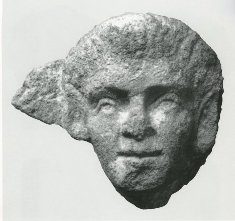 - Kopf mit dem Ansatz des Halses. In Höhe des rechten Ohres ein Relief – oder Skulpturrest anstehend. Raue Oberfläche, Kinn und Nase bestoßen. Am Hals Zahneisenspuren.