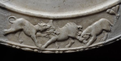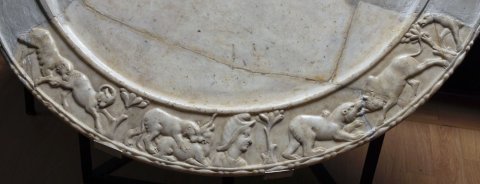 - Auf dem Rand der runden Tischplatte Tierjagdszenen, dazwischen Bäume und eine Jünglingsbüste mit phrygischer Mütze.