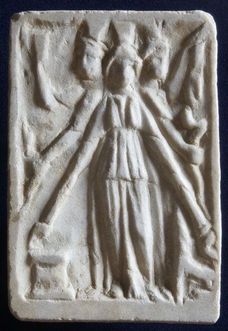 - Mythische Figur : dreileibige Hekate mit Fackeln, Schlange, Schlüssel, Bogen. Rechts unten Hund, links Altar.