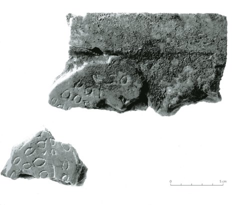 - Wegen der gleichen, ein Leopardenfell wiedergebenden Ritzungen, gehört dieses Fragment zusammen mit Nr. 21245 wahrscheinlich zu demselben Bild. Rückseite geglättet. Geringe Qualität. Einheimische Produktion.