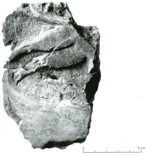 - Laufendes Tier ? Bei der abgebildeten Orientierung scheint die hintere Hälfte eines nach links gewendeten stehenden Huftieres (?) vorzuliegen. Die Strukturen heben sich nicht durch Ritzungen, sondern tiefere Einkerbungen voneinander ab. Rückseite bossiert mit viel Ziegelmörtel, auch auf der Kante. Geringe Qualität. Einheimische Produktion. Jagd oder Tierhetzen ? Zur homogenen Serie zusammen mit Jäger (?) 21235, und Tierdarstellungen 21241, 21244-21246, 21248, 21250, 21251, 21253 gehörend. Dies liegt aufgrund der geringen Unterschieden in der Ausarbeitung nahe. Parallelen für Friese mit diesen Themen aus Italien und Provinzen, s. Horisberger 2004, 217.