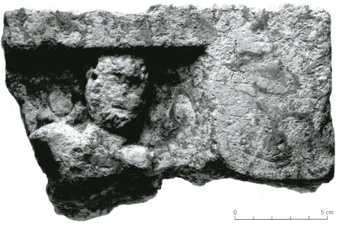 - Von einem leicht in Dreiviertelansicht nach links gebeugten Mann sind nur Oberkörper und Kopf erhalten. Seine runden Augen, sein Bart und seine Stirnlocken sind nur mit Mühe erkennbar. Zwei Bohrlöcher unter der Achsel, drei hinter der Schulter und fünf auf der Höhe des Kopfs betonen das Relief. Rahmung: Stableiste oben, breite Fläche rechts, Schrägleiste.