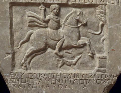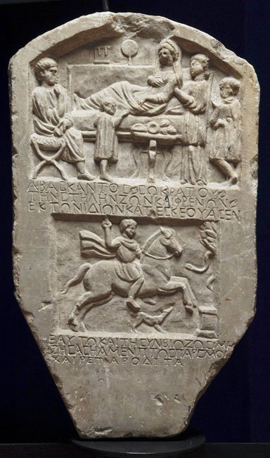 - Oben Bildfeld mit Totenmahl : Frau auf Kline, links Mann auf Klapphocker, rechts stehende Frau (Tochter), zwei Diener, Tischchen mit Speisen. Im unteren Bildfeld Thrakischer Reiter mit Hund, vor ihm Baum mit Schlange und Altar.