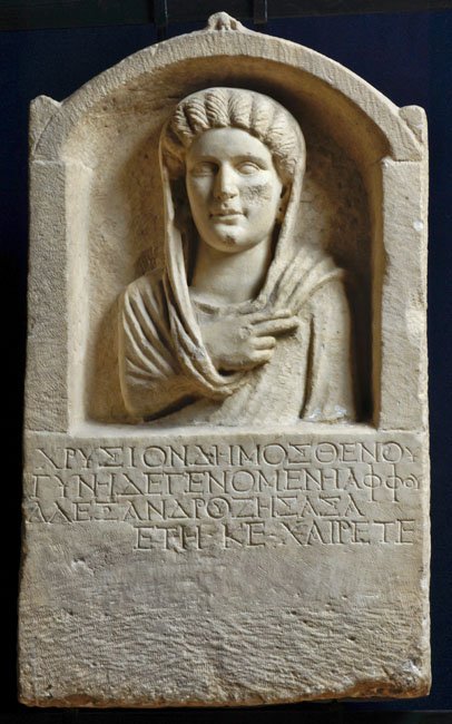 Χρυσίον Δημοσθένου / γυνὴ δὲ γενομένη Αφφου / Ἀλεξάνδρου ζήσασα / ἔτη ∙ κεʹ ∙ χαίρετε.