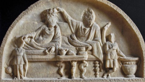 - Über dem gerahmten Schriftfeld bogenförmiges Relief mit Totenmahl: ehepaar auf Kline, links Dienerin mit Kanne, rechts Diener vor Krater. Tischchen mit Gefäßen.
