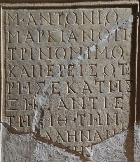 - griechisch : Μ(άρκῳ) Ἀντωνίῳ / Μαρκιανῷ Πα/τρίνομίμω / καὶ ἱερεῖ Σωτεί/ρης Ἑκάτης / Ζήσαντιε / ---