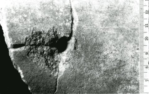 - Kelchkrater. Lippe etwas ausladend. Wandung leicht bauchig. Der Außendekor besteht soweit erhalten aus Kanneluren, die diagonal, ca. 3,3 cm unterhalb der Lippe entspringen und wahrscheinlich nach links in S-Form geschwungen sind. Auf der Innenseite befinden sich zwei tiefe Dübellöcher, die 8 cm Abstand voneinander haben und 3,6 cm vom Rand entfernt sind. Ein zweites Paar der Dübellöcher wird von Dybois auf der gegenüberliegenden Seite ergänzt. Laut Horisberger liegt es nahe, die Dübellöcher als eine Halterung für Metallstifte zu verstehen, die den Ausfluss einer Blei, – oder Bronzefontäne hielten, Vgl. Horisberger 2004, 229 Abb. 326. Diese Konstruktion konnte durch ein anderes Beispiel noch nicht belegt werden.
