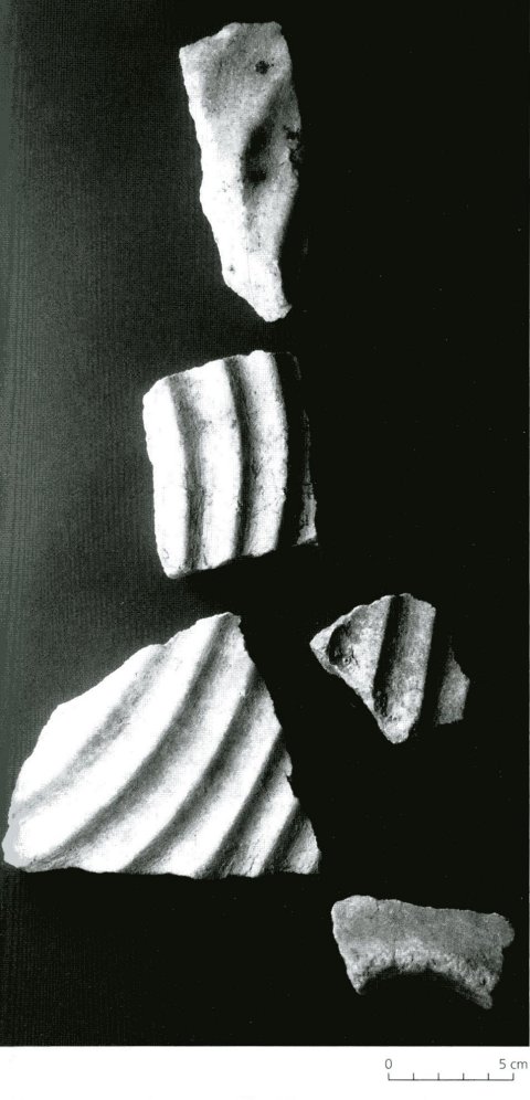 12 Fragmente. 7 Bruch an Bruch anpassend. Kat. 975 stammt vom Gefäßboden mit einer runden Öffnung. Fuß verloren.