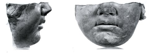 - Kopffragment. Oberer und hinterer Teil antik abgebrochen. Von der Frisur ist nur noch links ein Teil einer Locke übriggeblieben. Nasenspitze und Kinn modern bestoßen. Leichte Versinterung der Oberfläche und Wurzelfasern an den Bruchstellen.