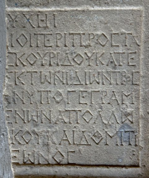 [ἀγαθῆι τ]ύχηι. / [---]ι οἱ περὶ προστά/[την τὸν δεῖνα Διο]σκουρίδου κατε/[σκεύασαν ---] ἐκ τῶν ἰδίων πρὸς / [---]ν ὑπογεγραμ/[μένον, ἐπιμελουμ]ένων Ἀπολλω/[νίου ---]κοῦ καὶ Δομιτί/[ου Ἡρακλ]έωνος.