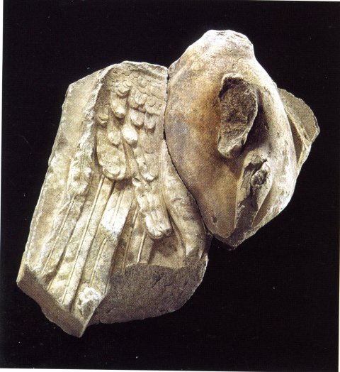Von der Darstellung sind erhalten: ein Teil des Vogelkörpers von vorne und im 3/4 Profil, mit noch anhaftenden Resten des Kopfes und des r. Beines, ein großer Teil des ausgebreiteten l. Flügels, sowie der Ansatz des r. Flügels. Der lange Hals war ursprünglich freiplastisch gearbeitet, da kein Rest von ihm am Körper anhaftet. Am unterem Rand des l. Flügels ist eine Pranke einer (Raub-)Katze erkennbar. Realistische und nuancierte Wiederhabe der Flügelstruktur und des Vogelkörpers.