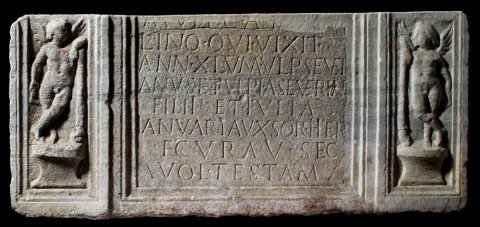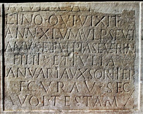 - M(arco) Ulpio Ca[tul]/lino qui vixit / ann(os) XLV M(arcus) Ulp(ius) Seve(r)i/anus et Ulpia Severian(a) / filii et Iulia / Ianuaria uxsor(!) her(edes) / f(aciendum) curav(erunt) sec(undum) / vol(untatem) testam(enti)