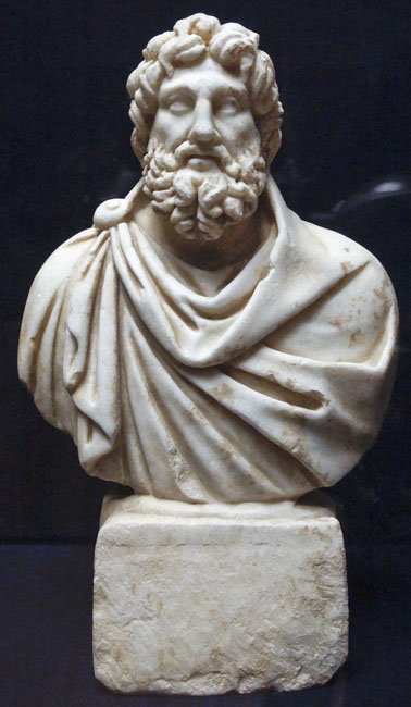 - Porträt eines älteren Mannes mit langem Vollbart und lockigem Haar mit Binde (Kranz ?). Mantel auf der rechten Schulter mit Scheibenfibel zusammengehalten.