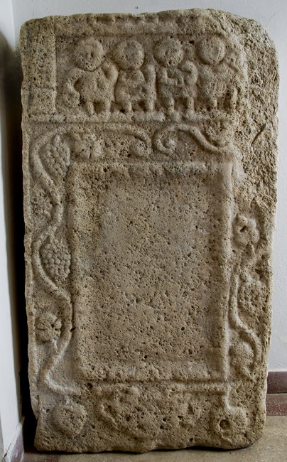 - Oben Bildfeld mit vier Ganzfiguren in kurzem Gewand, darüber Reliefspuren. Um das Schriftfeld Weinranken, die aus einem Krater wachsen.