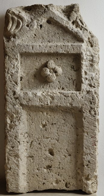 - Stele mit Giebel und Palmettenakroteren. Bildfeld mit Rosette. Leeres Schriftfeld.