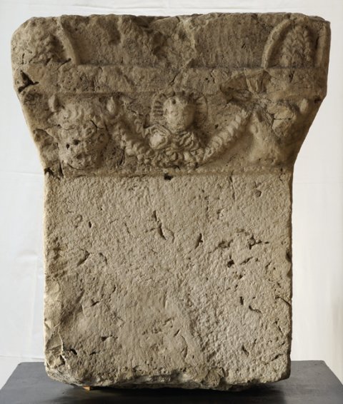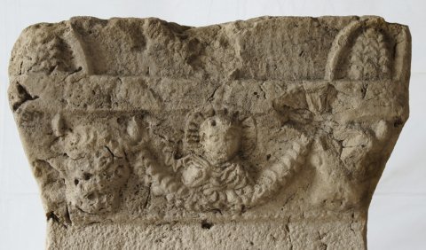 - In der Gesimszone zwischen Stierköpfen aufgehängte Girlande, im Girlandenbogen Büste des Sol (Mithras). Eckakrotere mit Blattdekor.