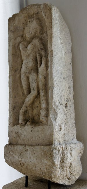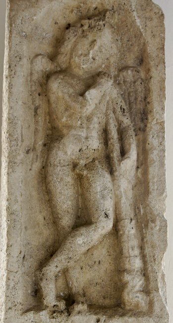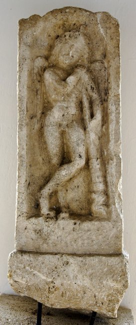 - Trauergenius: auf gesenkte Fackel gelehnter nackter geflügelter Knabe mit langen Locken