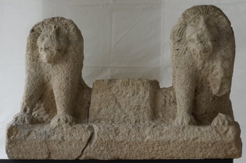 - zerbrochen, verwittert, linkes Vorderbein des rechten Löwen tlw. abgebr.