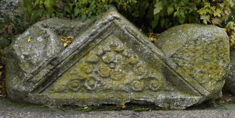 - Dachförmiger Deckel mit Akroteren. Im Giebelfeld Rosette und Ranken.