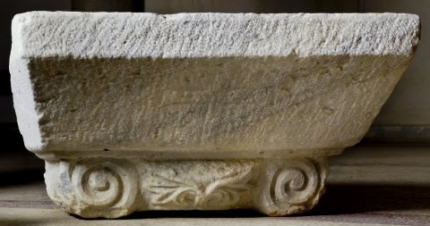 - Kapitell mit Volutenpolster (pulvini), auf dem Kämpfer eingraviertes Kreuz