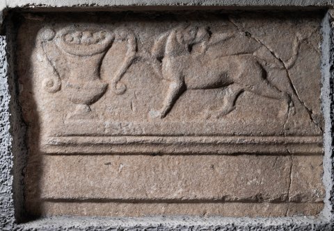 - Architrav-Fries: Krater mit Früchten zwischen stehenden Greifen