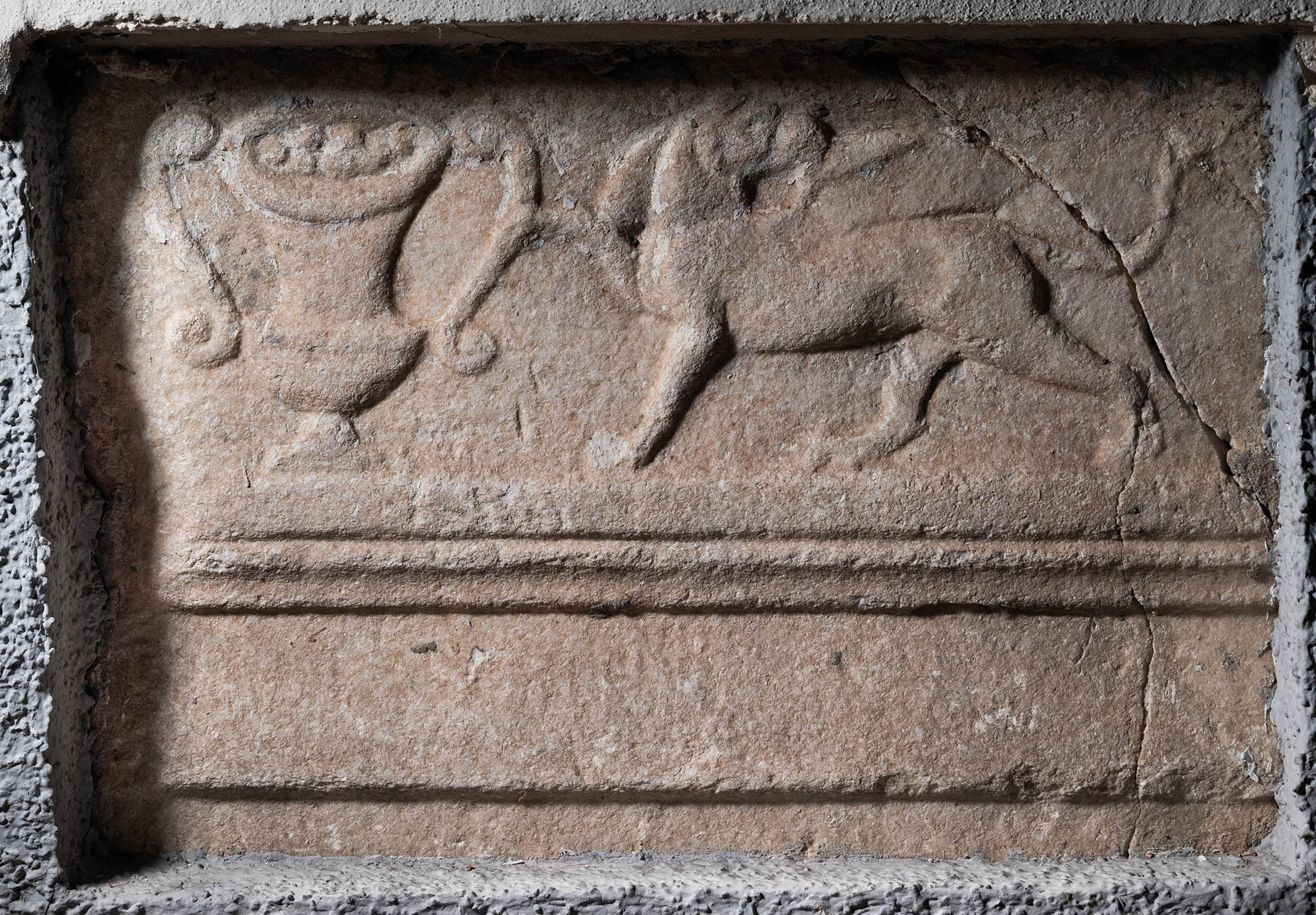2134 Gebälkfragment mit Krater zwischen Greifen