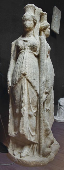 - Mythische Figur: dreileibige archaistische Hekate mit Polos und Attributen (Fackel, Kanne, Hund).