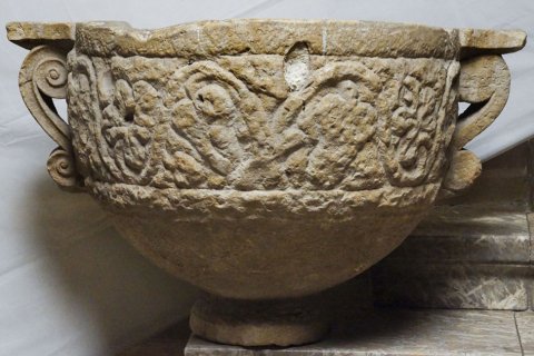 - Weites steilwandiges Gefäß mit niedrigem Fuß und Volutenhenkeln, zwischen den Henkeln Rankenfries.
