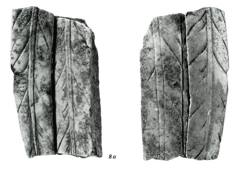 - Das Fragment stammt vom Rand eines rechen Flügels. Die Innenseite leicht nach innen gewölbt. Zwei lange, sich knapp überlagernde Federn. Die Kiele sind ‚zweispurig’ – die Federäste nur durch unregelmäßige und minimal geschwungene Ritzlinien angegeben. Die Außenseite ist, wie bei ID 21366, nachlässig gearbeitet. Oberfläche geglättet.
