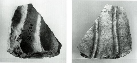 - Rundum unregelmäßig gebrochen. Oberfläche wurde durch Lagerung im Boden angegriffen und stumpf.