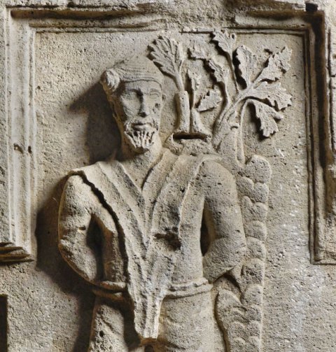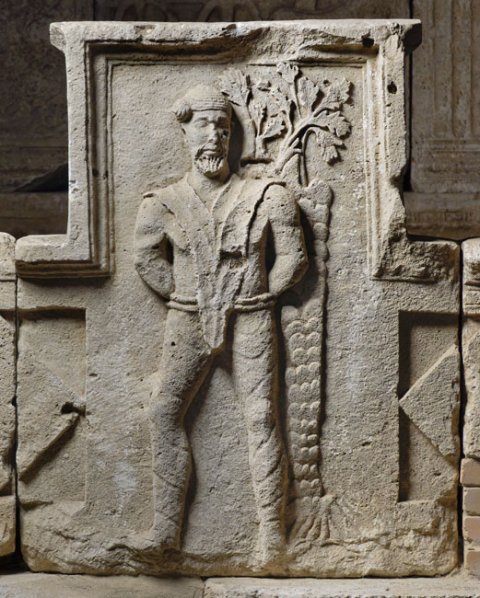 - Gefangener bärtiger Daker mit Haarknoten über dem rechten Ohr, kleinem Umhang und Hosen mit Schnurgürtel. Rechts hinter ihm Eichbaum.