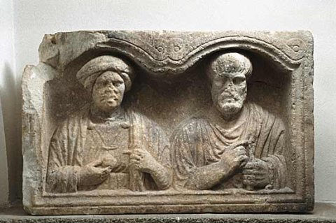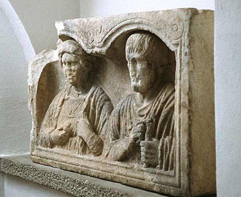 - In Nische mit Doppelbogen zwei Brustbilder (Ehepaar). Links einheimische Frau: Haube, gegürtetes Gewand, Fibeln, Brosche, Umhang, Halsband mit Lunula, in der Rechten Granatapfel. Rechts Mann: bärtig, Tunica, Toga, in der Linken Rolle (volumen).