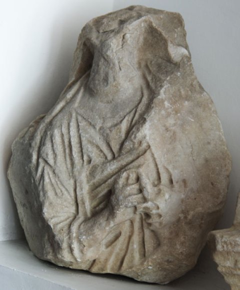 - In Kranzrahmen Brustbild eines Mannes: Tunica, Toga, in der Linken Rolle (volumen).
