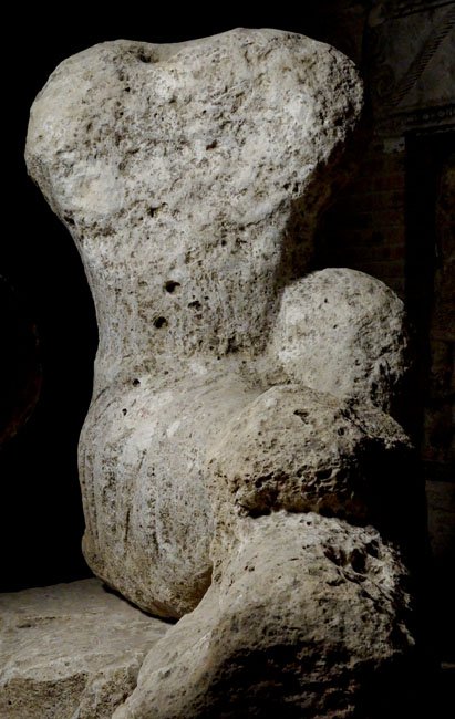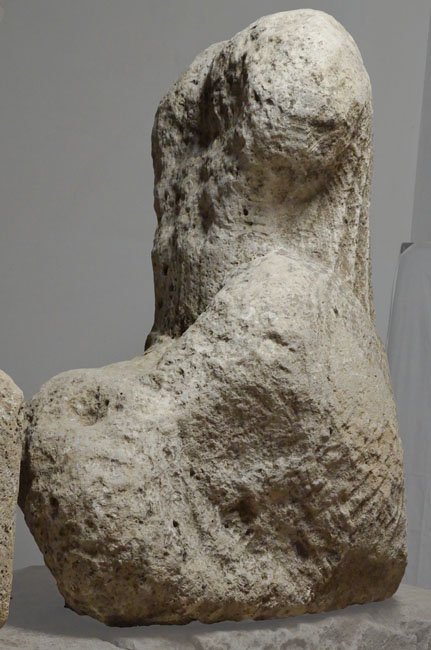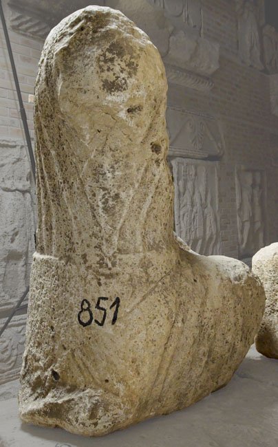 - Rumpf mit Armansätzen und Oberschenkeln erhalten, stark verwittert
