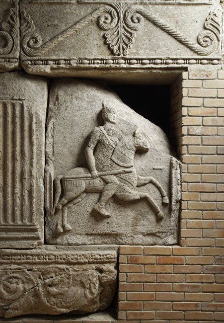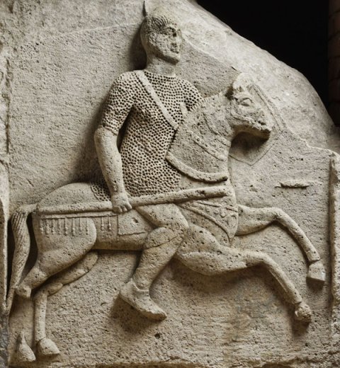 - Reiter (Soldat) im Panzerhemd mit Schwertgurt, in der gesenkten Rechten Lanze.