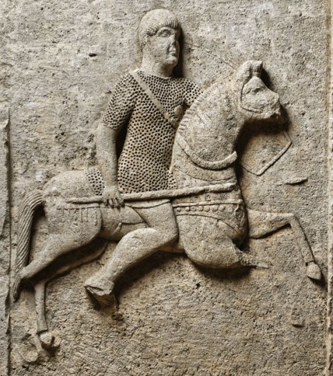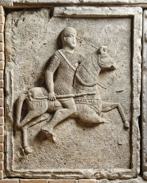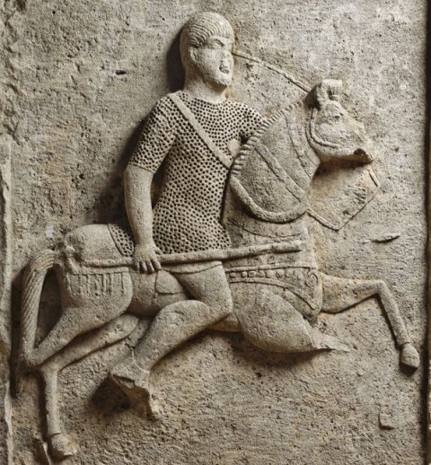 - Reiter (Soldat9 im Panzerhemd mit Schwertgrut, in der gesenkten Rechten Lanze.