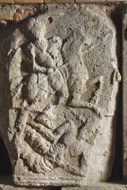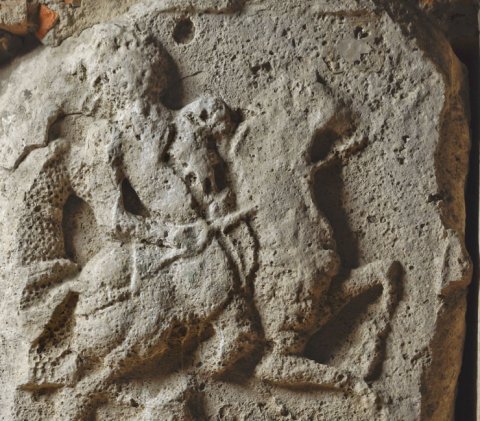 - Reiter (Daker, Decebal ?) mit Lanze reitet über einen Gefallenen in Hosen hinweg, von hinten hält ihn ein römischer Soldat im Panzerhemd zurück.