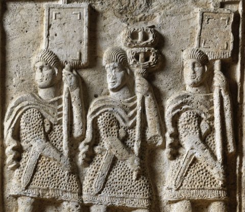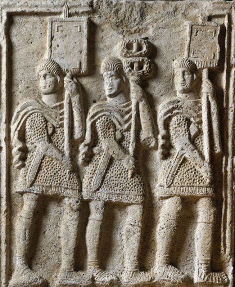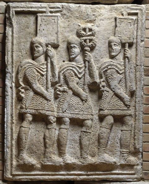 - Drei Standartenträger (signifer). Soldaten im Panzerhemd mit Gürtel und Schwert (gladius), kleinem Mantel und geschnürten Stiefeln. Der mittlere trägt zwei Kränze an einer Stange, die äußeren Lanzen mit rechteckigen Standarten (signum) mit Fransen und Beschlägen.