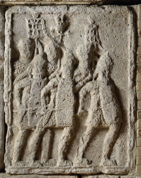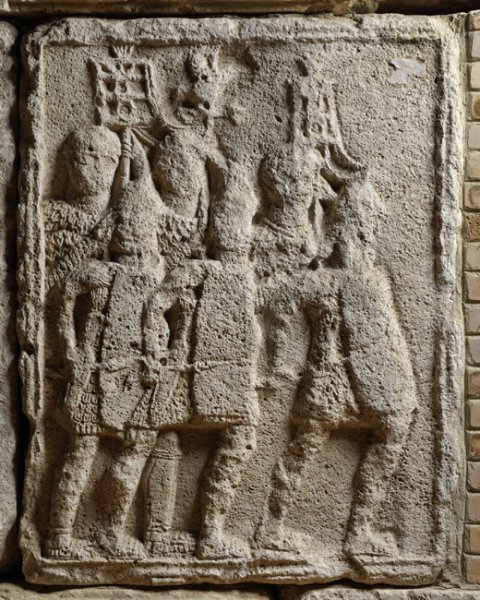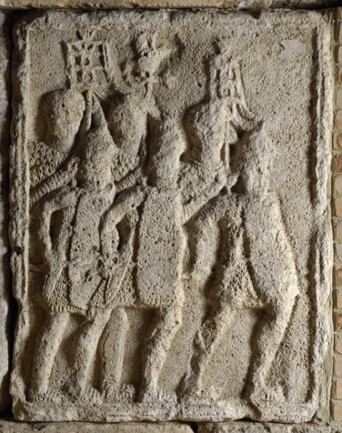 - Drei Soldaten mit Helm, Panzer, Schild, Beinschienen, Schwert (gladius) und Pilum vor drei Standartenträgern (signifer) im Panzerhemd, der mittlere mit Legionsadler.