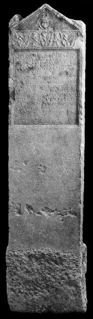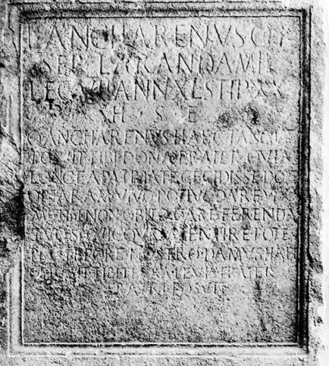 - L(ucius) Ancharenus Q(uinti) f(ilius) / Ser(gia) Laranda mil(es) / leg(ionis) VII ann(orum) XL stip(endiorum) XXI / h(ic) s(itus) e(st) / Q(uintus) Ancharenus haec tanquam / posuit tibi dona frater quia / longe a patria te cecidisse dolet / optaram vivo potius dare vina / me tib(i) non obito care ferenda / tuo si quicquam sentire potes / [pro te]mpore nostro damus haec / ostica sit tibi terra levis frater / fratri posuit