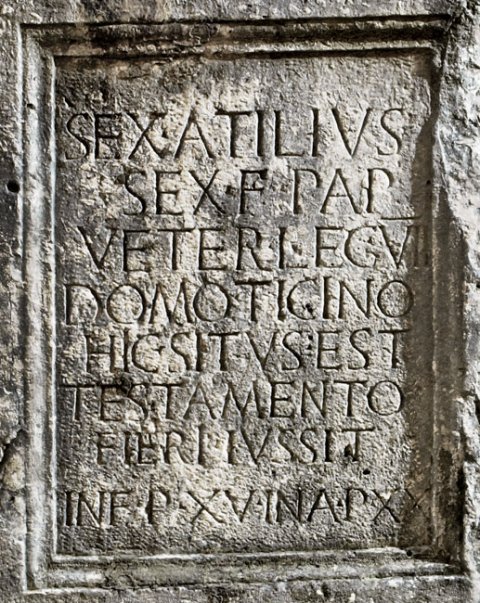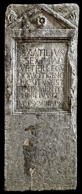 - Sex(tus) Atilius / Sex(ti) f(ilius) Pap(iria) / veter(anus) leg(ionis) VII / domo Ticino / hic situs est / testamento / fieri iussit / in f(ronte) p(edes) XV in a(gro) p(edes) XX