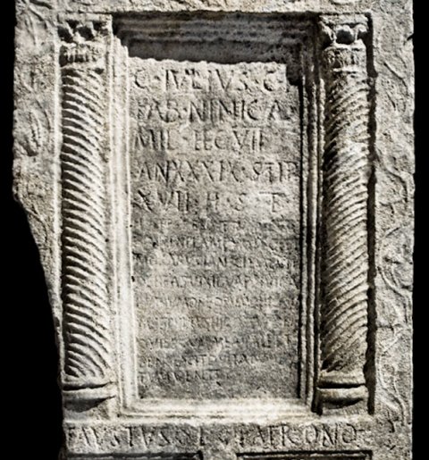 - C(aius) Iulius C(ai) f(ilius) / Fab(ia) Ninica / mil(es) leg(ionis) VII / an(norum) XXXIX stip(endiorum) / XVII h(ic) s(itus) e(st) / hospes resis[te et] tumulum / contempla meum lege et / morarus(!) iam scies quae / debeas vixi qua potui ca/rus sum Opiorum hic su/m sepultus hic ossua(!) re/quiescum(!) mea vale et / bene facito vitae dum fa/tum venit // Faustus l(ibertus) patrono