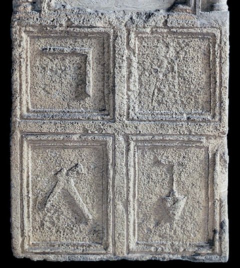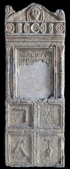- Giebel mit gorgoneion und Akrotere. Darunter Waffenfris (Schilde). Gerahmtes Schriftfeld zwischen Säulen mit Spiralkannelur. Unterhalb Tür mit vier Kassetten, darin Werkzeuge (oben Winkeleisen und Zirkel, unten Axt und Lot).