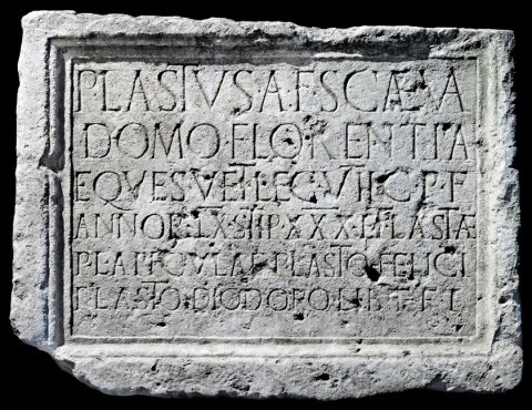 - P(ublius) Lastus A(uli) f(ilius) Scaeva / domo Florentia / eques vet(eranus) leg(ionis) VII C(laudiae) p(iae) f(idelis) / annor(um) LX stip(endiorum) XXX et Lastae / P(ubli) l(ibertae) Apiculae P(ublio) Lastio Felici / P(ublio) Lasto Diodoro lib(erto) t(estamento) f(ieri) i(ussit)