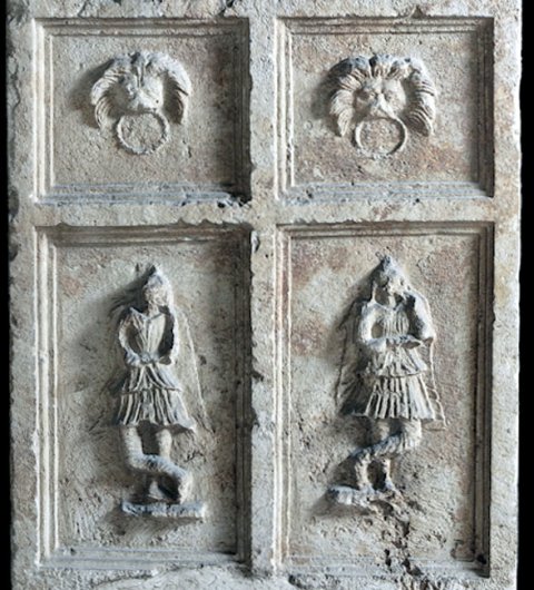 - Porträtnische und gerahmtes Schriftfeld zwischen Säulen mit Spiralkannelur. Büste im Mantel. Unterhalb der Inschrift Tür mit vier Kassetten, in den oberen Löwenkopf-Türklopfer, unten je ein trauernder Attis.