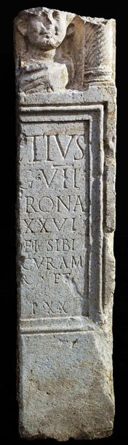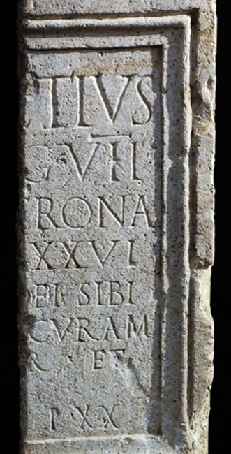 - [C(aius) Lucr]etius / [signif(er)? le]g(ionis) VII / [C(laudiae) p(iae) f(idelis) dom(o) V]erona / [an(norum) XLV stip(endiorum)] XXVI / [de suo peculi]o f(aciendum) i(ussit) sibi / [et Primo suo] curam / [egerunt frate]r et / [Chrestus lib(ertus) / in fr(onte) p(edes) X in agr(o)] p(edes) XX